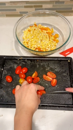 - Dice veggies (keep dense veggies, like sweet potato separate)