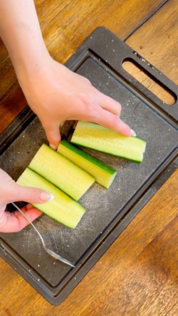 - Cut your hothouse cucumber in half down the middle. Reserve half for another time. Take one half and cut again down the middle. Cut each of these halves down the center to expose the inside. You should have 4 pieces.
